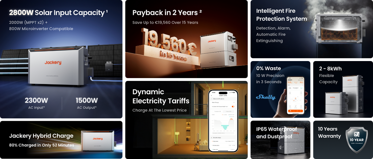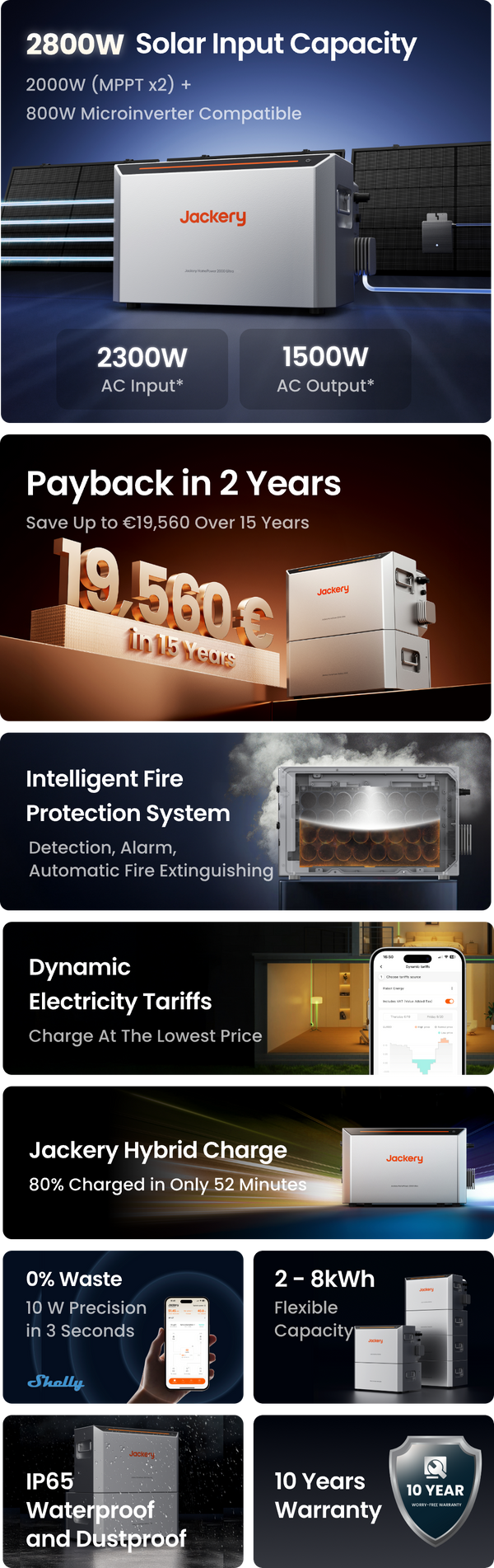 Calculation is based on an electricity price of €0.40 per kWh. Actual savings may vary depending on usage and conditions. The “2 Years Payback” claim is based on the following system setup: Jackery HomePower 2000 Ultra, 2,800W solar input, smart meter, and four mounts.