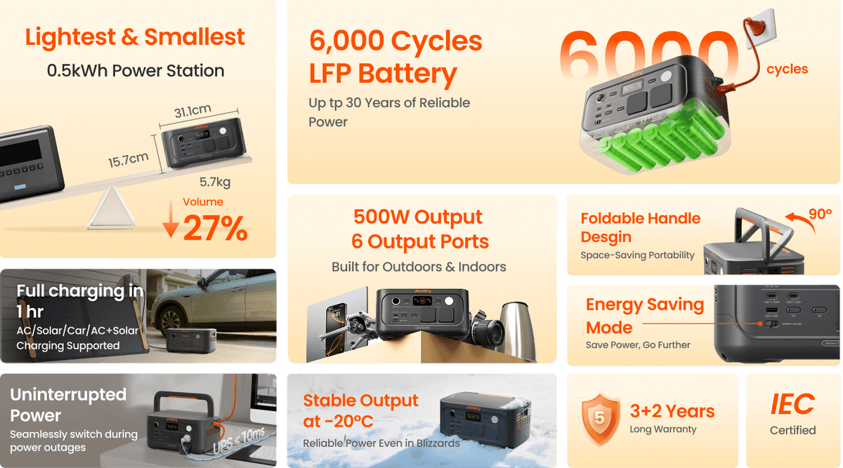 Stay powered at camp with ease—run your camping lights, portable fridge, and charge your phone and laptop for a cozy and connected trip with Jackery 500 v2.