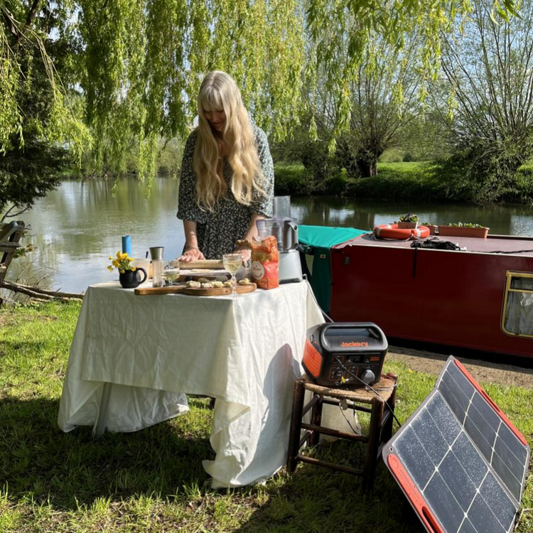 We have the Jackery Explorer 500, and it really was a game changer for us. We already have two solar panels on board, but we love the Jackery because it is also portable, and we can take it on journeys when we travel away from our boat with our van. It is so important for the environment to be off grid on a boat because otherwise we would need to use our leisure batteries of the boat, and they are usually powered by Diesel. Marlon is using the Jackery for his woodturning craft, to charge his electric saws and for all our other on-board appliances, phones and laptop. I even have a record player I charge with the Explorer 500.