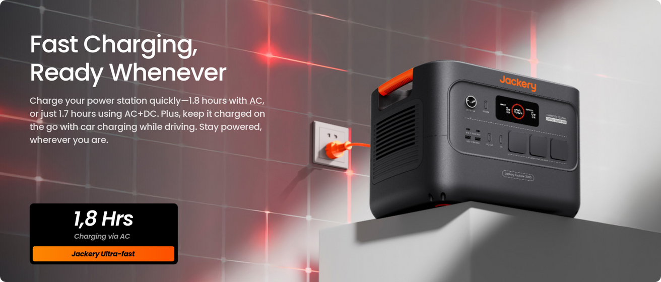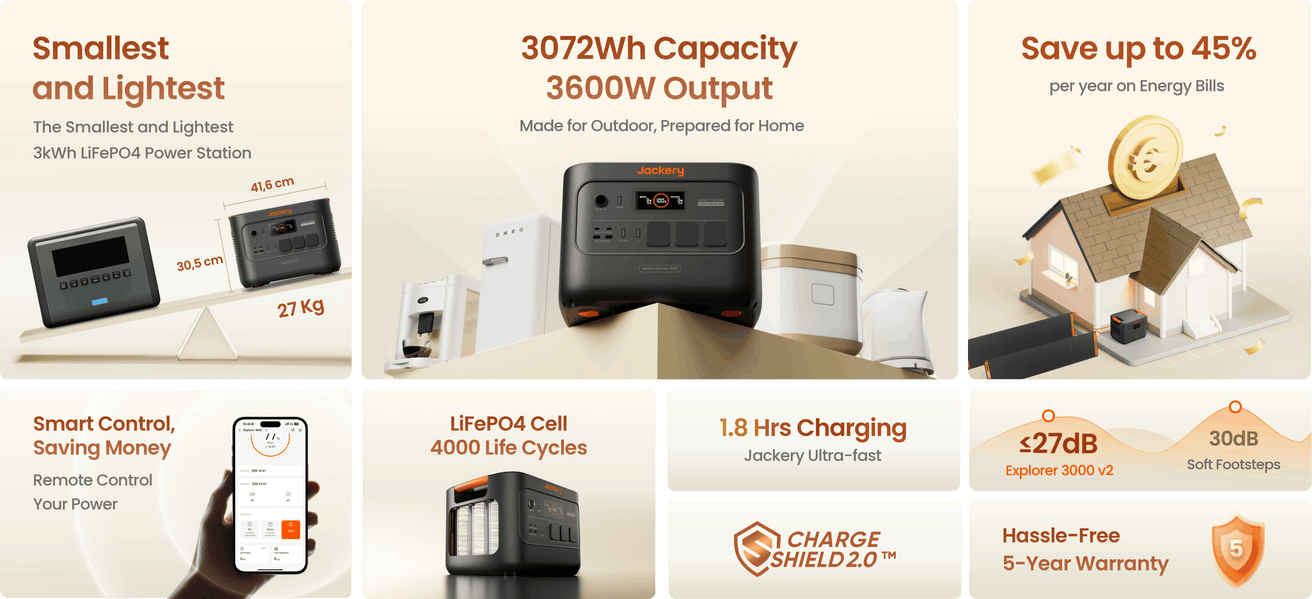 ② 3072Wh Massive Capacity - Powers home essentials like fridges for 30+ hours.¹ Paired with Jackery SolarSaga panels, it’s perfect for emergency backup or long off-grid adventures.