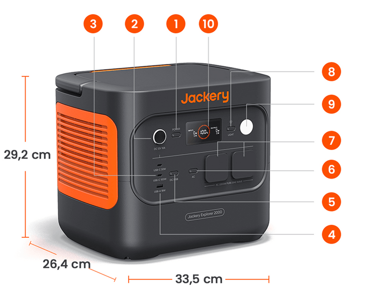 The Jackery Explorer Portable Power Station 2000 v2 delivers an impressive 2042Wh capacity and 2200W output, capable of powering most of your household appliances. It also features 2 AC outlets, 1 USB-A 18W, and 2 USB-C ports ( 100W + 30W), allowing you to charge multiple devices like phones and laptops simultaneously.