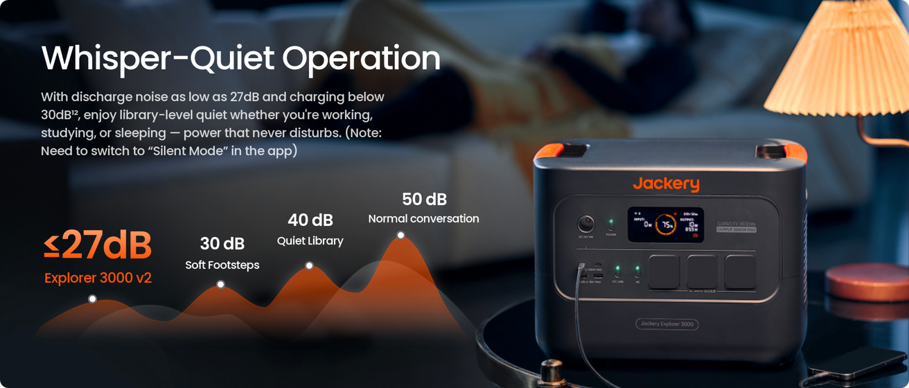 Note 4: At a constant temperature of 25°C and with a 20% load, the product's discharge noise can be as low as 27dB. Data sourced from Jackery Laboratories. Please refer to actual data for accuracy.
