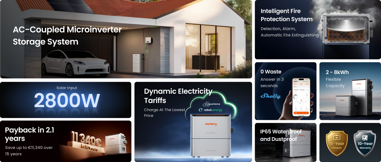 2. The annual savings of €945 are calculated based on the following system setup: Jackery HomePower 2000 Ultra, three expansion batteries each with a capacity of 2kWh, 3500W solar generation, a Smart Meter, and four brackets with electricity costs at €0.25/kWh. This figure is for reference only; actual savings may vary depending on usage and environmental conditions.