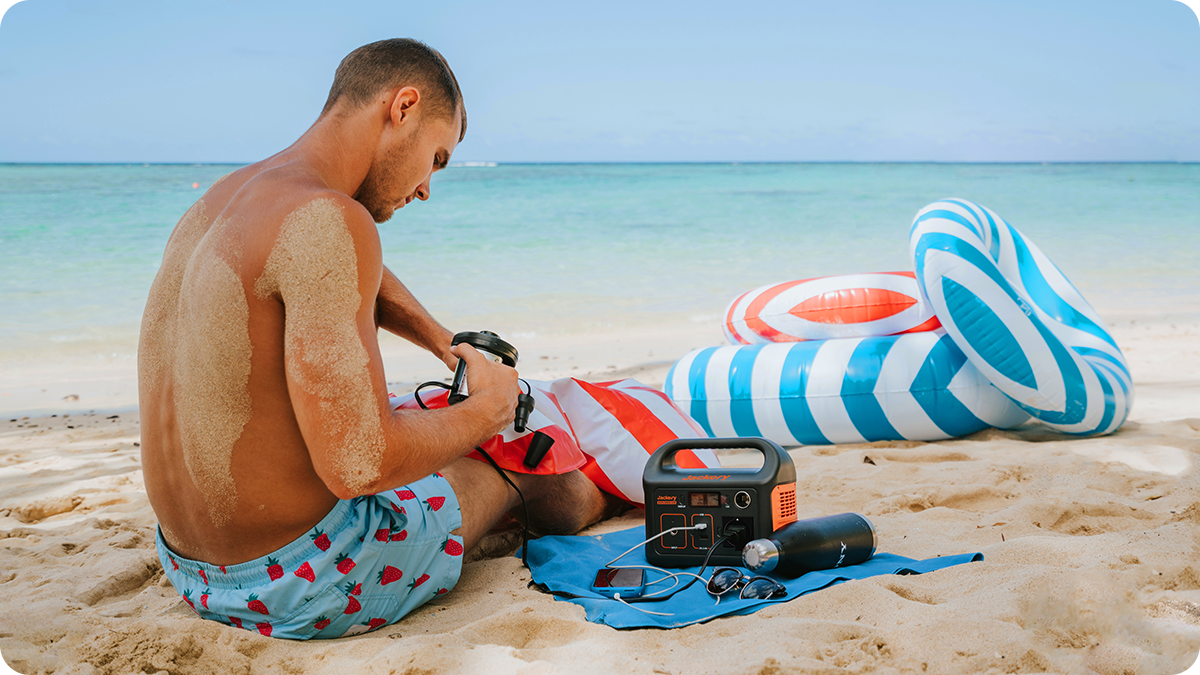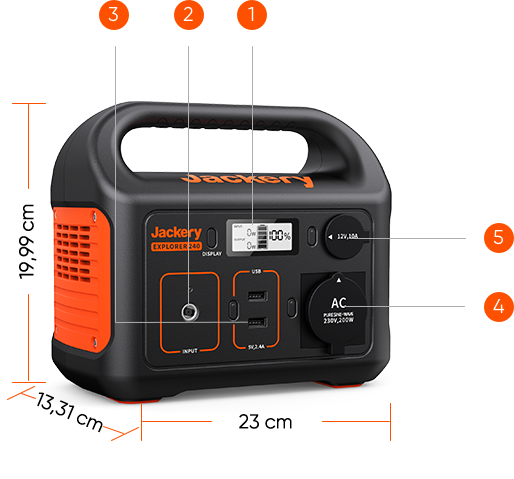 Jackery Explorer 240 portable power station features a 240Wh lithium-ion battery. The multifunctional outputs including 1*AC wall outlet, 1*DC car port and 2*USB-A ports as well as a pure sine wave inverter can power many devices at the same time.