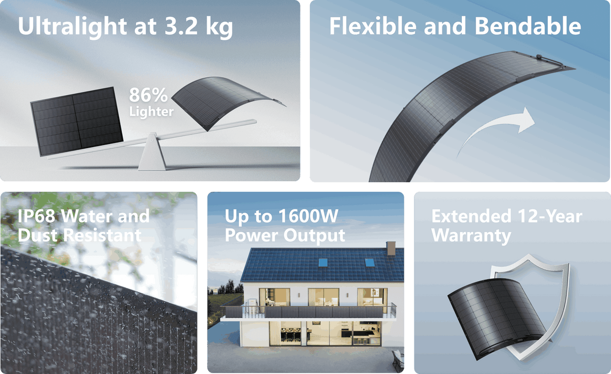 • Ultra-lightweight at just 3.2 kg — one-third the weight of traditional 200 W glass panels, easy to install